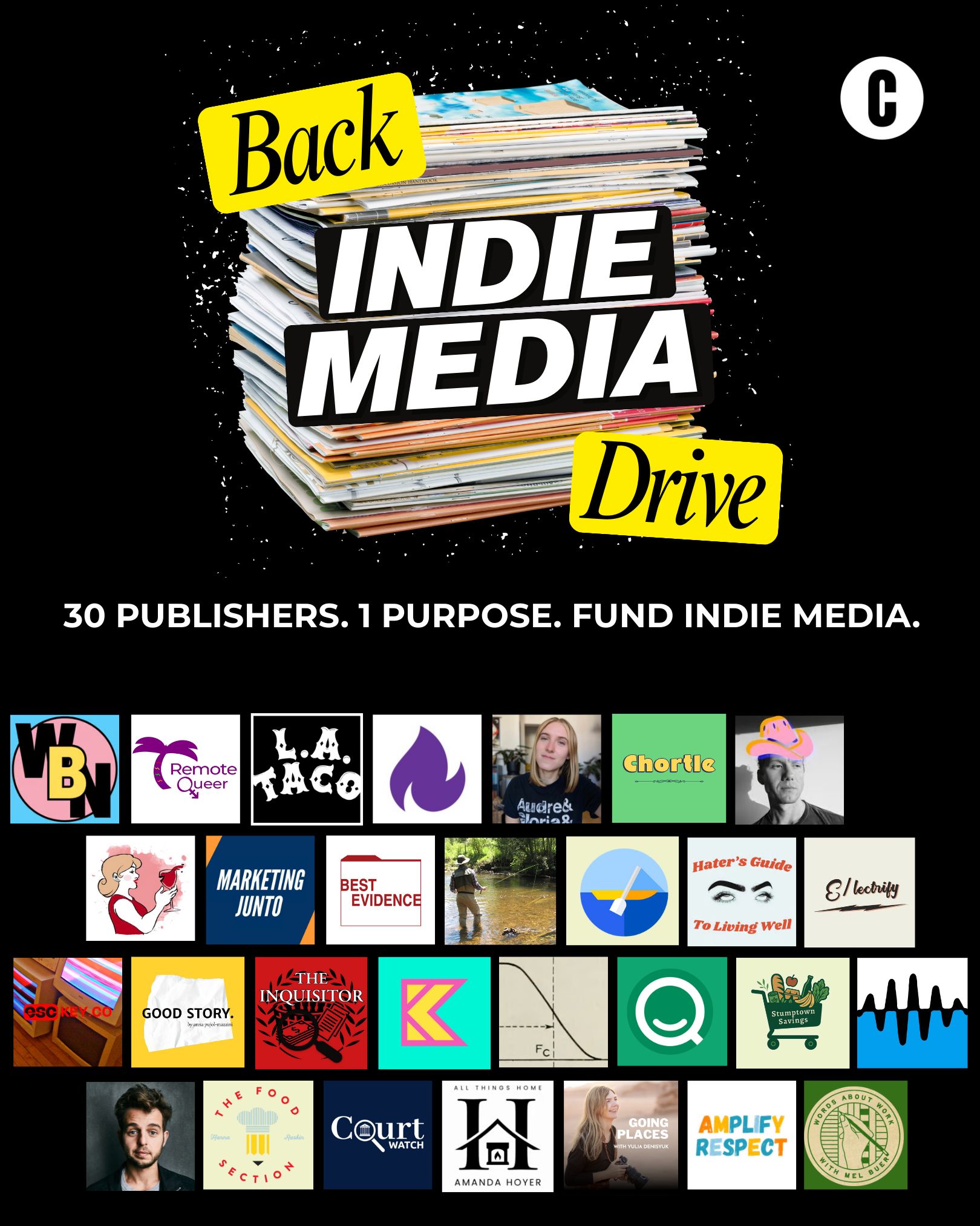 Organized by Project C, this drive brings together a group of newsletters, podcasts, and studios (like mine), such as The Food Section, Continuous Wave, and Court Watch, that are built out of the need to tell important stories. We want to remind readers that indie media isn’t just viable, it’s the future.
